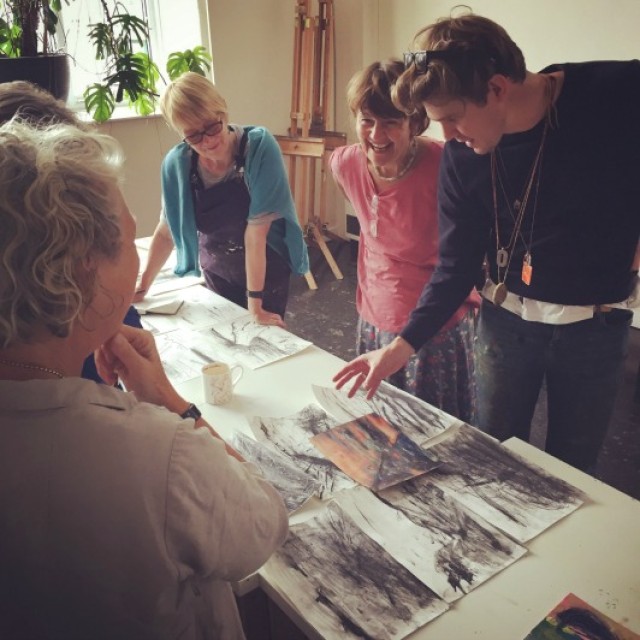Teaching is tailored to individual needs and includes one-to-one tuition and group demonstrations using a variety of tools such as brushes, knives, sticks, hands or rags and a variety of paints and techniques.