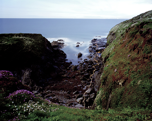 James' remarkable long-exposure photographs are taken at night and contain light trails made with a torch or burning paper across the landscapes of Cornwall and Southern England. Derived from a tradition of Land Art, with Richard Long the obvious precursor, James seeks to interact with the environment in a performative sense. His seductively beautiful works are essentially the record of an action in the landscape, and blur the boundary between artist and subject.